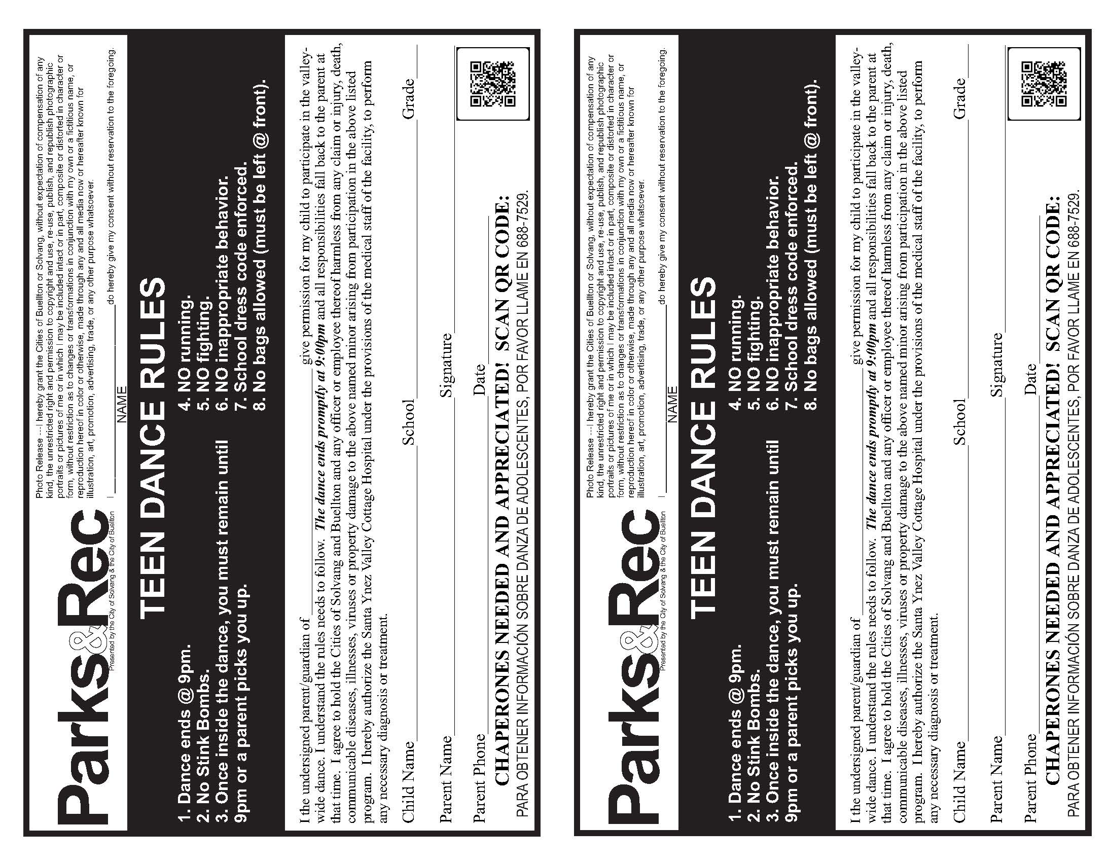 The Spring ValleyWide Middle School Dance will be held at Buellton Rec for 6th-8th Graders. Santa Ynez Valley schools only, Student ID is required.. $10 per person. Tickets can be purchased in advance or at the door. The dance is from 7-9 PM. Permission Slips required and chaperones needed!